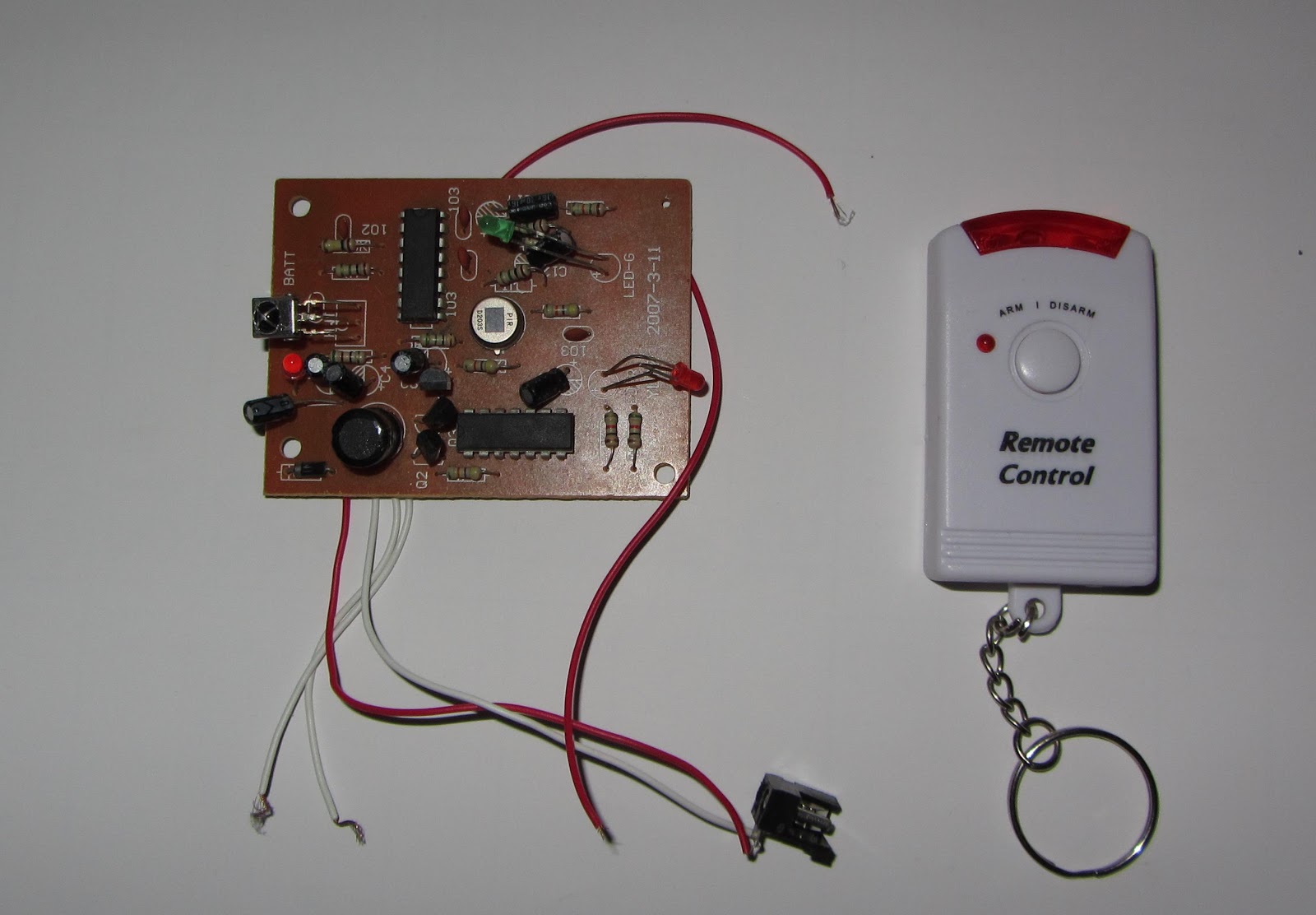 The circuit board is connected to an infrared motion-activated alarm system with a remote control so it can be turned off from a distance. When it detects movement, an LED lights up and a siren sounds to warn the potential target to get out of the way.