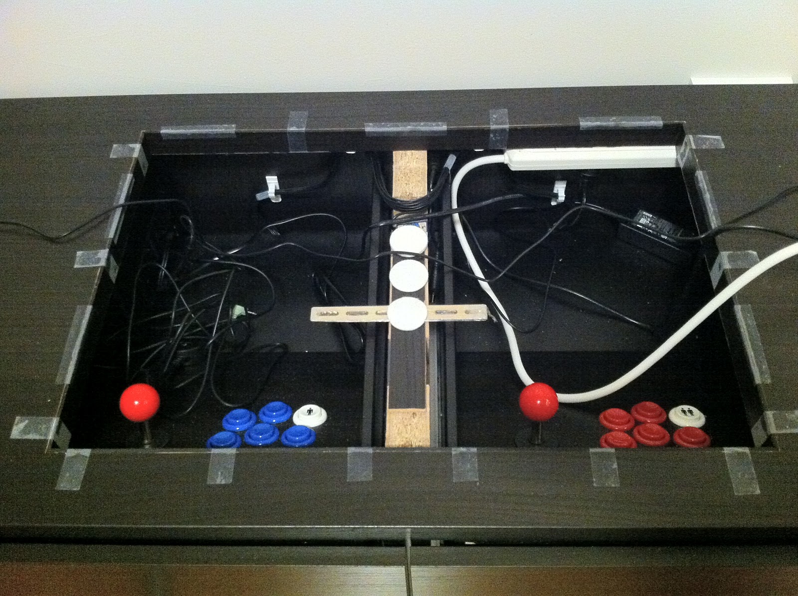He started with just an ordinary IKEA table and drawers, then cut out a space for an LCD monitor. The controls (including joysticks!) are mounted on the drawers so that when they close, it just looks like a normal coffee table.